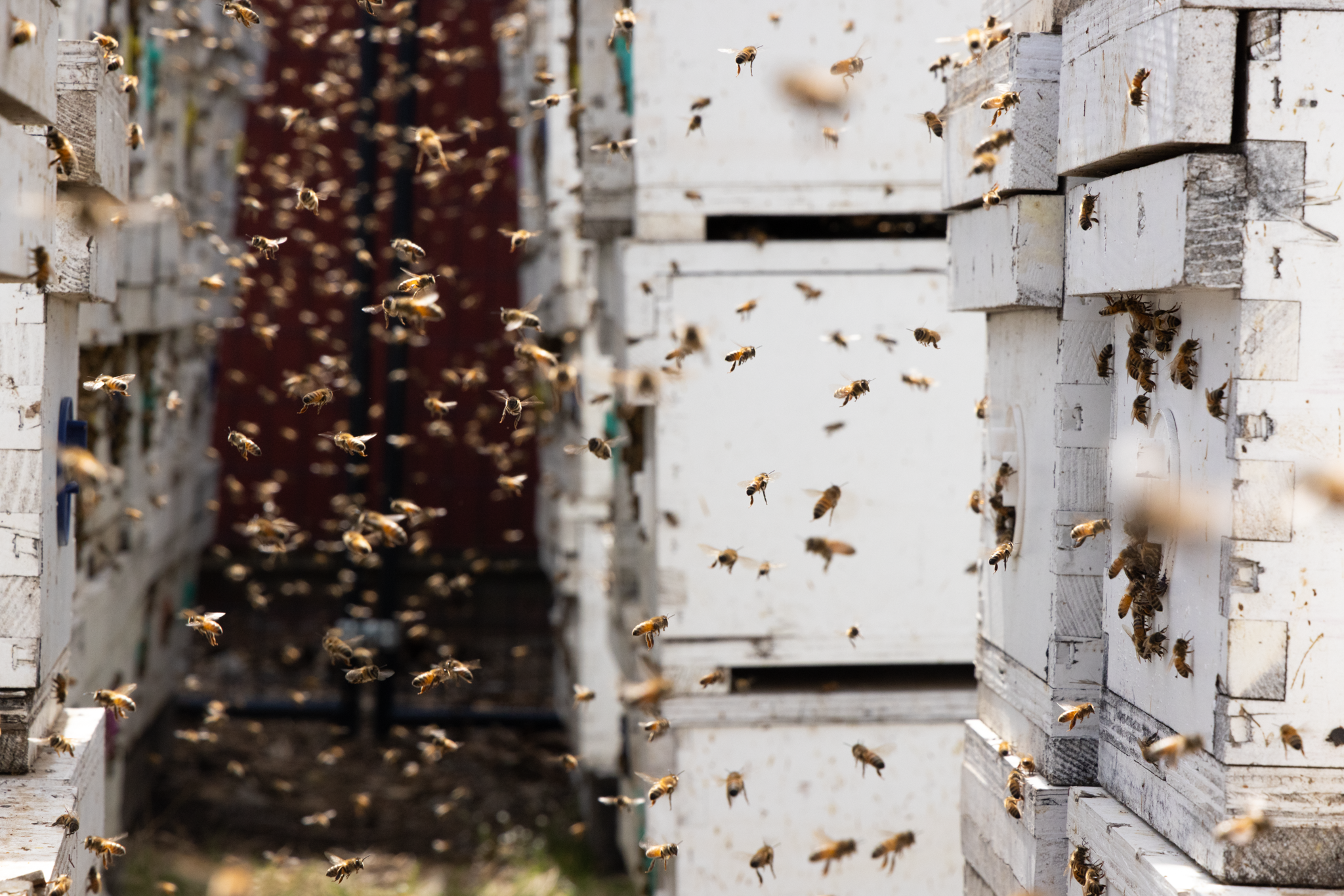 Every year, about this time in April, we receive hundreds of nucleus colonies (known as “nucs”) to distribute to new and existing beekeepers in our area. A nucleus colony is essentially a beehive starter-kit; it contains all the essential building blocks of a working colony, as well as the necessary bees to do the work. Our nucleus colonies each contain a frame of brood, a frame of pollen, and a frame of honey, as well as the workers, drones, and queen to kickstart production! Our beekeepers will take these frames of bees and transfer them to a fresh Langstroth hive, where the bees quickly get to work decorating their new home.